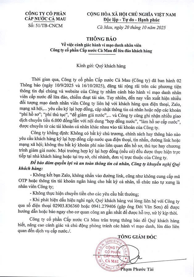 Trong thời gian gần đây, Công ty cổ phần Cấp nước Cà Mau ghi nhận có nhiều đối tượng mạo danh nhân viên Công ty để thực hiện hành vi lừa đảo khách hàng như: yêu cầu khách hàng cung cấp căn cước công dân, giấy tờ nhà đất để ký lại hợp đồng dịch vụ kèm hứa hẹn giảm giá tiền nước. Đồng thời, đối tượng lừa đảo sẽ đe doạ ngưng cấp nước nếu khách hàng không thực hiện, yêu cầu khách hàng kết bạn Zalo hoặc truy cập đường link giả mạo để ký hợp đồng trực tuyến,... Nhằm bảo vệ quyền lợi người dân và uy tín Đơn vị, Công ty đã chủ động phát thông báo cảnh giác, đồng thời phối hợp với các cơ quan chức năng và truyền thông để tuyên truyền, hướng dẫn người dân nhận biết và phòng tránh lừa đảo.